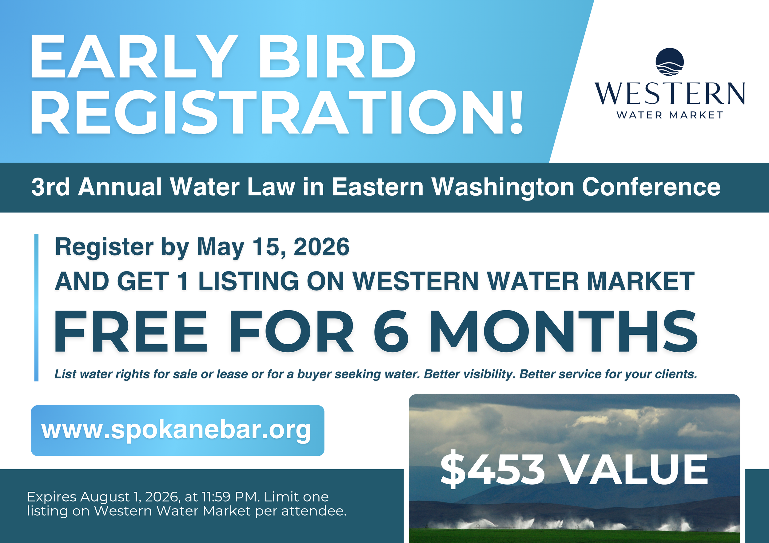 Register by May 15, 2026, and receive a complimentary 6-month listing on Western Water Market (a $453 value). Expand your reach, generate more exposure, and better serve your clients with this free listing on Western Water Market.